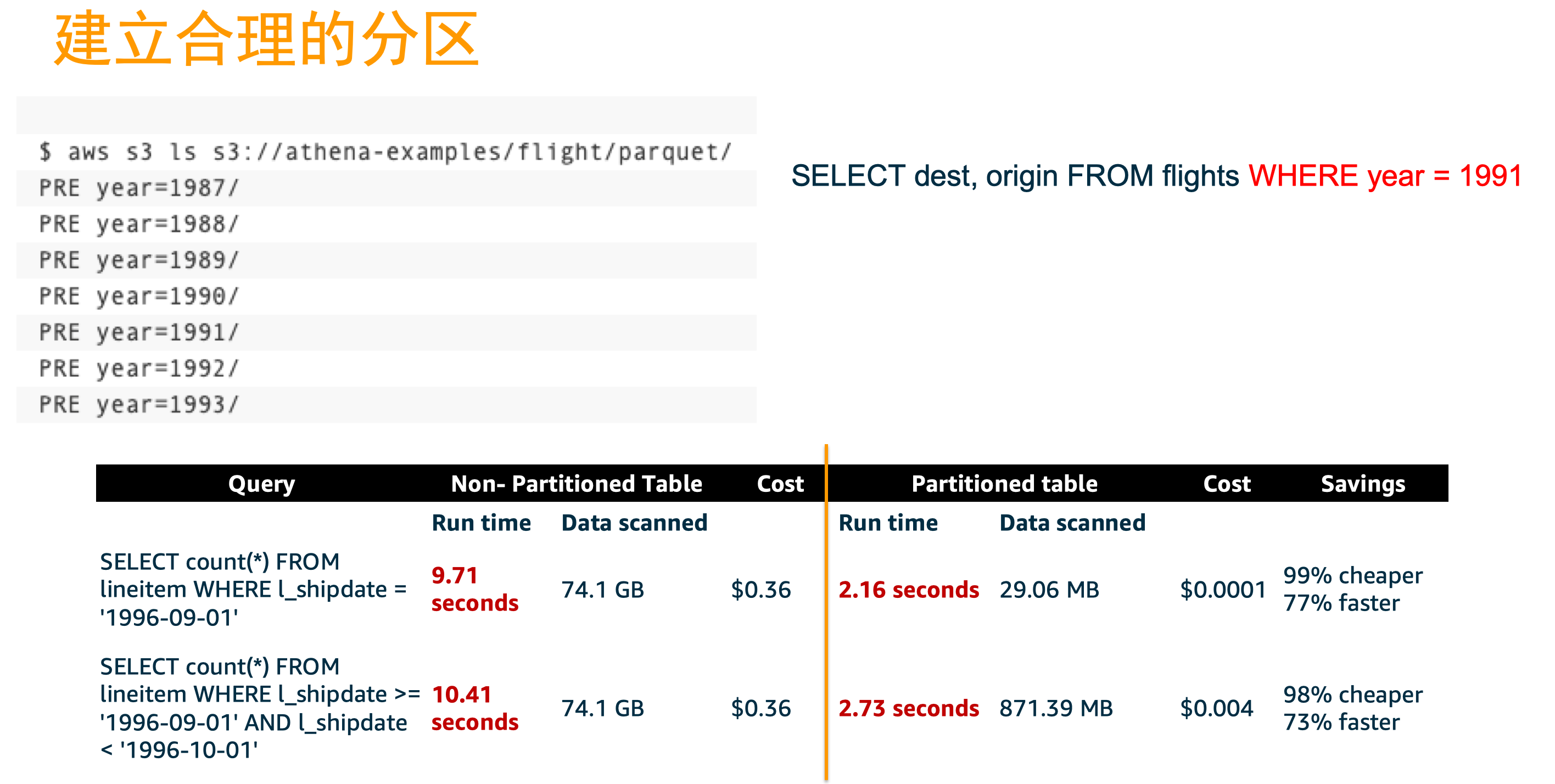 如上所述,对于大型数据集,应实现基于时间的分区。这提供了一个很好的常规导航机制,并减少了访问一组文件之前必须"列出"的数据量。这可显著提高查询用户的性能并降低成本。请考虑一下select * where 和select * 的区别。