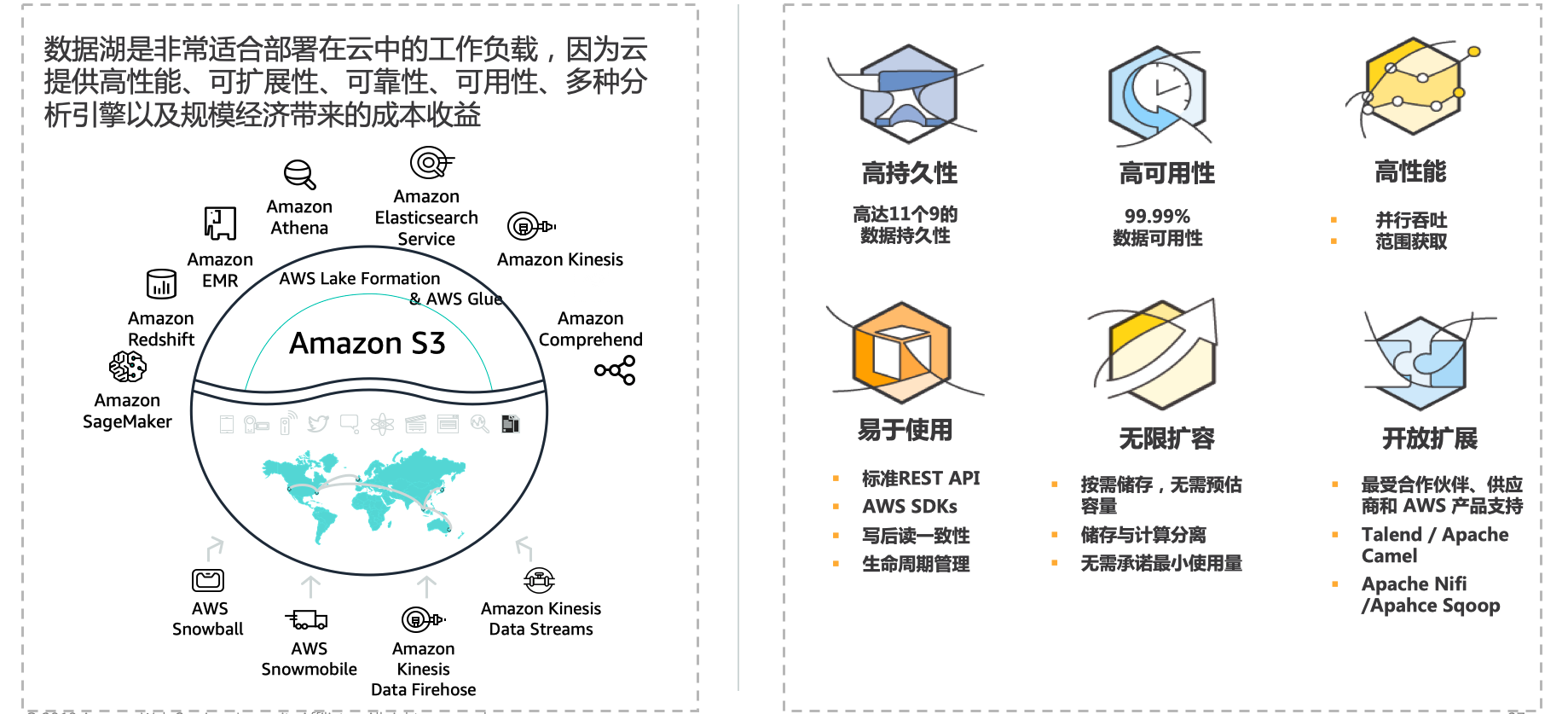 Amazon S3让多租户环境的构建变得非常轻松,不同用户可以在其中将自己的独特数据分析工具与一组通用数据对接起来。与需要建立多套分布式数据副本的传统解决方案相比,多租户环境能够显著改善成本与数据治理能力。为了进一步降低访问门槛,Amazon S3还提供简单的RESTful API,目前Apache Hadoop以及大多数第三方独立软件供应商(ISV)及分析工具供应商已经在支持这些RESTful API。