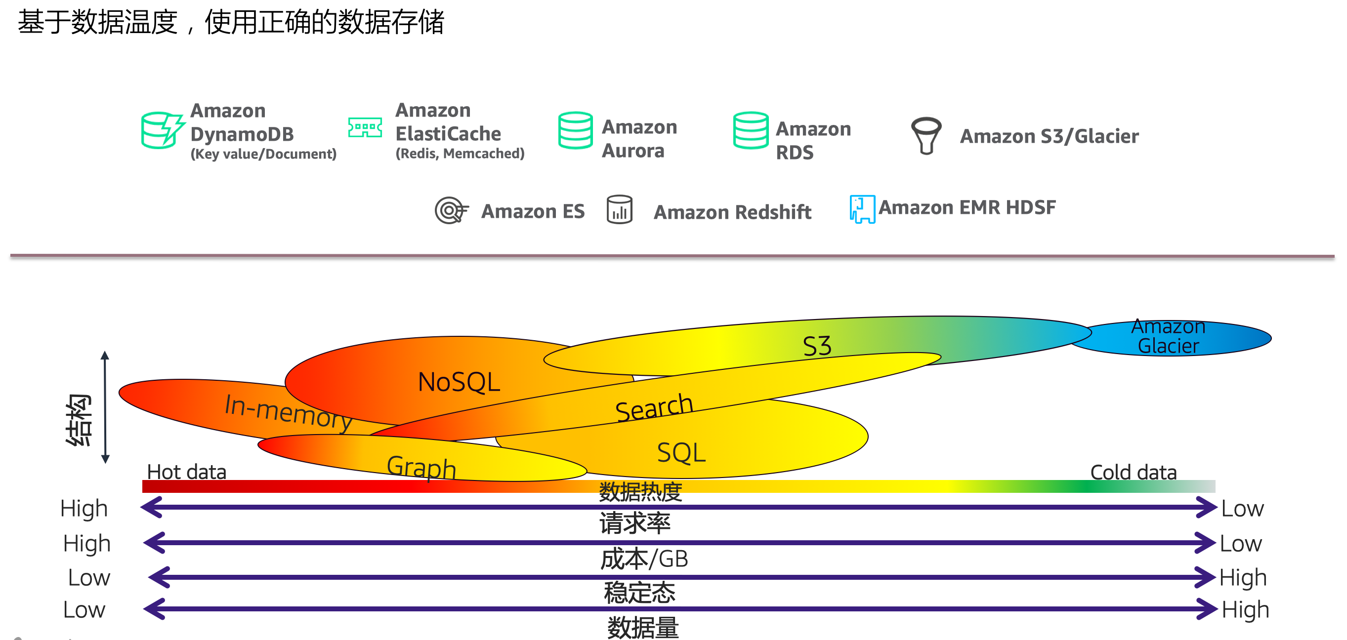 对于一个数据分析架构的整体设计,我们应该考虑数据的稳定选择对应的存储位置,AWS提供了多种不同温度层级的数据存储选项,我们应该从整体架构设计角度设计对应的存储位置。例如在有点典型的推荐系统中,我们会将流处理和批处理计算出来的类似商品表(结果表)保存在dynamodb中,以便应用程序可以快速的读取推荐表中的对应数据,低延迟的向最终用户返回推荐信息。