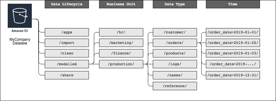 对于共享存储桶,数据湖设计前缀层次结构需要因地制宜的进行设计,例如: