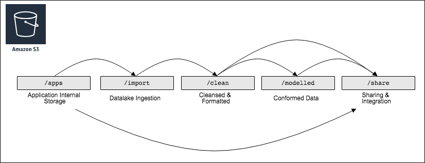 我们应仔细设计前缀结构以支持所需的安全和数据分层模型。对于本指南的下面部分,我们将假设您对数据湖中的所有内容都使用单个 S3 存储桶,如上图所示,该存储前缀的第一个字段都是数据管道中的"生命周期阶段"。