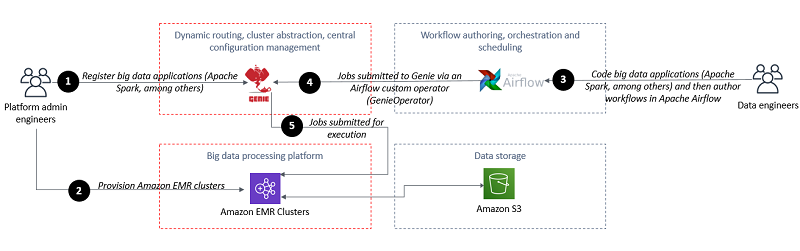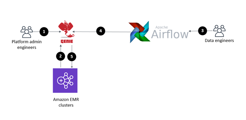 从高层次来看,平台管理工程师团队准备支持的大数据应用程序及其依赖项,并在 Genie 中注册它们。平台管理工程师团队启动Amazon EMR 集群,并将其在启动期间注册到 Genie 中。